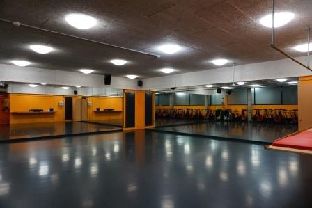 Die Halle lässt sich mit Trennwänden unterteilen, wovon jedes Drittel mit einer eigenen Musikanlage ausgestattet ist.